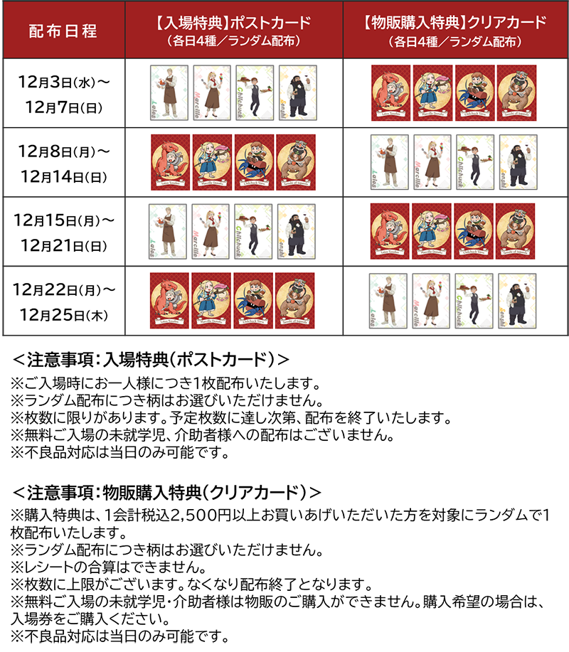 - 混雑時には入場規制を行います。物販エリア入場まで待ち時間が発生する場合がございますのであらかじめご了承ください。